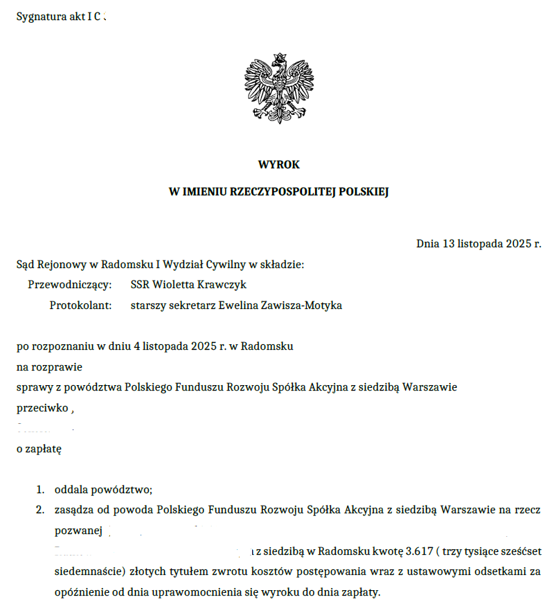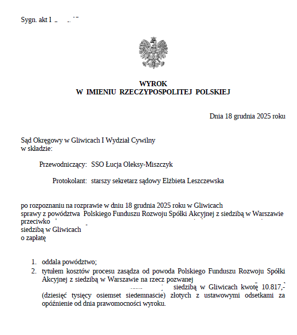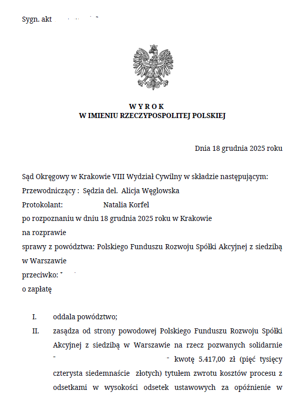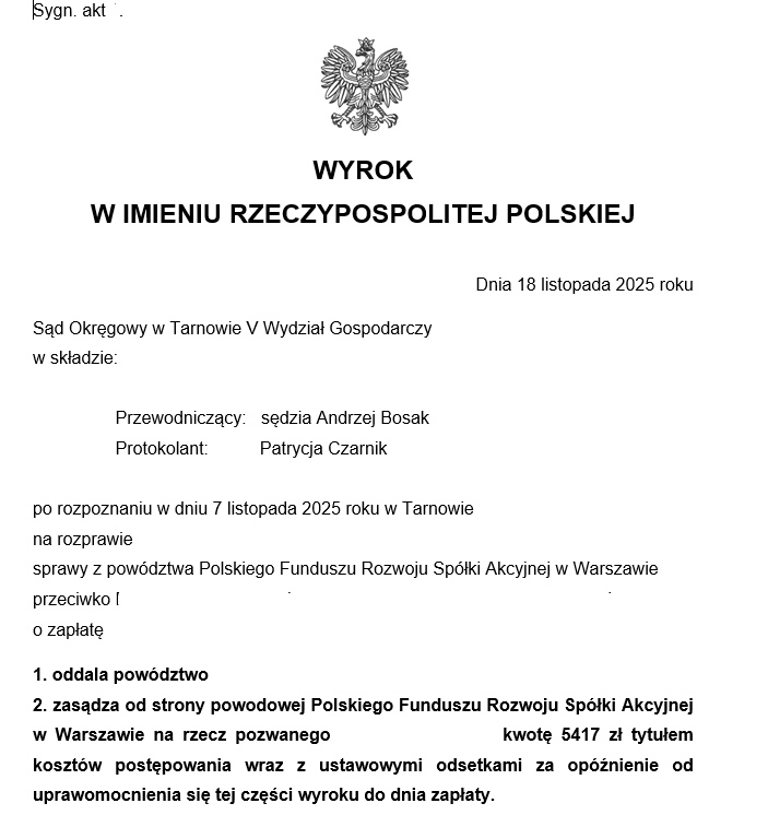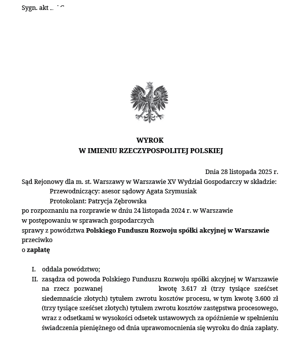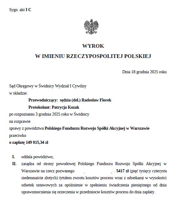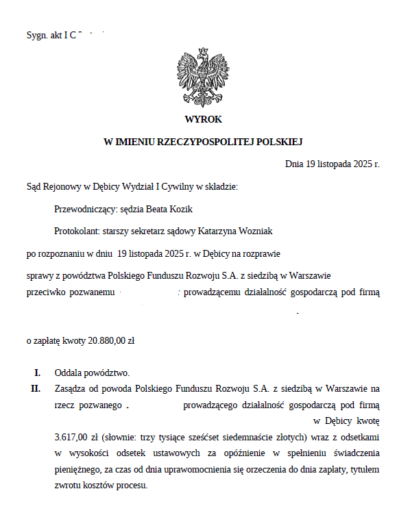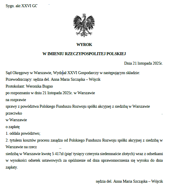 Wiele osób trwa w błędnym przekonaniu, że PFR jako spółka państwowa posiada jakieś szczególne przywileje czy uprawnienia. Nic bardziej mylnego. PFR jest dokładnie taki samym kontrahentem jak każdy inny i nie można o tym zapomnieć. Oznacza to w szczególności, że PFR nie ma możliwości ot tak zająć rachunku bankowego beneficjenta. Konieczne jest tutaj przejście tej samej drogi co każdy przedsiębiorca – procesu sądowego o zapłatę. Dopiero prawomocny wyrok opatrzony klauzulą wykonalności może być podstawą do jakichkolwiek działań egzekucyjnych.